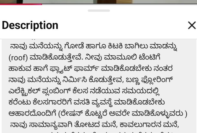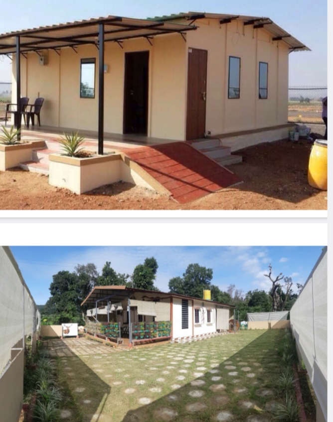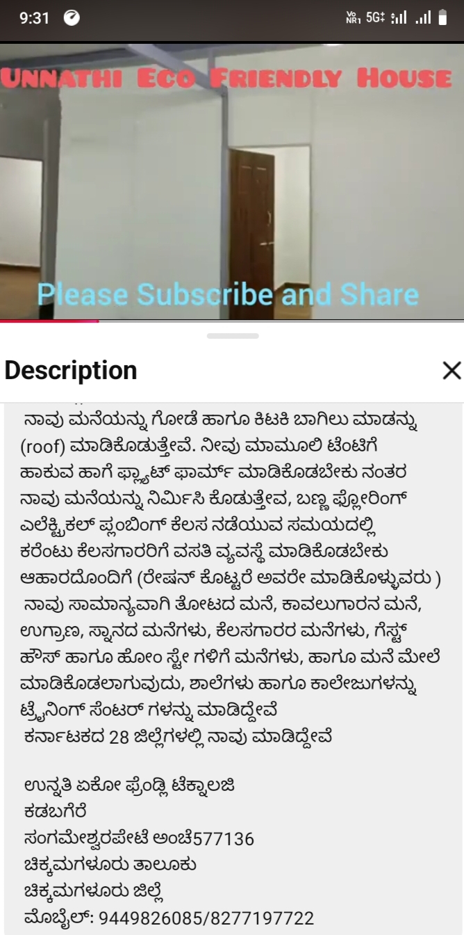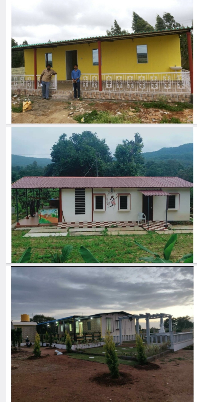 ಮನೆಯನ್ನು ಕರ್ನಾಟಕದ ಯಾವ ಭಾಗದಲ್ಲಾದರೂ ಕಟ್ಟಬಹುದು ಅತಿಯಾದ ಮಳೆಯ ಪ್ರದೇಶಗಳಾದ ಆಗುಂಬೆ ಹಾಗೂ ಕೊಟ್ಟಿಗೆಹಾರದಲ್ಲಿ ಮಾಡಿದ್ದೇವೆ ಹಾಗೂ ಕರಾವಳಿ ಭಾಗಗಳಾದ ಮಂಗಳೂರು ಉಡುಪಿ ಮುರುಡೇಶ್ವರ ಹೊನ್ನಾವರ ಮಾಡಿದ್ದೇವೆ ಈ ಮನೆಯನ್ನು ಕಪ್ಪು ಮಣ್ಣಿನಲ್ಲಿ ಸಹ ಮಾಡಬಹುದು ಈ ಮನೆಯನ್ನು 900 ಚದರ ಅಡಿ ಕಟ್ಟುವಂಥ ಮನೆಯನ್ನು ಕೇವಲ 650 ಅಡಿ ಜಾಗದಲ್ಲಿ ಕಟ್ಟಬಹುದು ಇಟ್ಟಿಗೆ ಗೋಡೆಗಳಿಗಿಂತ ತೆಳುವಾದ ಗೋಡೆ ಇರುವುದರಿಂದ ಇದರೊಳಗೆ ಕಬ್ಬಿಣದ ಸರಳಗಳು ಇರುವುದರಿಂದ ಗಟ್ಟಿಯಾಗಿರುತ್ತದೆ ನಿಮ್ಮ ಜಾಗದಲ್ಲಿ ನಿರ್ಮಾಣದ ಸಮಯ ಕೇವಲ ಮೂರರಿಂದ ನಾಲ್ಕು ದಿವಸಗಳಾಗಿರುತ್ತದೆ ಎಲ್ಲಾ ತರದ ಗಾಳಿ ಹಾಗೂ ಮಳೆಯಿಂದ ಇದು ರಕ್ಷಿಸಲ್ಪಡುತ್ತದೆ ಹಾಗೂ ಈ ಮನೆಯನ್ನು ಒಂದು ಜಾಗದಿಂದ ಮತ್ತೊಂದು ಜಾಗಕ್ಕೆ ಸ್ಥಳಾಂತರಿಸಬಹುದು ಭೂಕಂಪದಿಂದ ರಕ್ಷಿಸಲ್ಪಡುತ್ತದೆ ಸುಲಭವಾಗಿ ಈ ಮನೆ ಸಂಜೆ ಸಮಯದಲ್ಲಿ ತಂಪಾಗಿರುತ್ತದೆ ಮಾಮೂಲಿ ಕಟ್ಟಿಸಿರುವಂಥ ಮನೆಗಳು ರಾತ್ರಿ ಹೊತ್ತಲ್ಲೂ ಬಿಸಿಯಾಗಿರುತ್ತದೆ ಮುಖ್ಯವಾಗಿ ಹಣ ಮತ್ತು ಸಮಯ ಎರಡು ಉಳಿತಾಯವಾಗುತ್ತದೆ ಡಬಲ್ ಬೆಡ್ರೂಮ್ ಮನೆಯನ್ನು ಮಾಮೂಲಿಯಾಗಿ 20 ರಿಂದ 22 ಲಕ್ಷಗಳು ಬೇಕಾಗುವುದು ಇದು ಕೇವಲ ಆರೂವರೆ ಇಂದ 7 ಲಕ್ಷಗಳಿಗೆ ಮುಗಿಯುತ್ತದೆ ಈ ಮನೆಯನ್ನು ನಾವು 2005ನೇ ಇಸವಿಯಿಂದ ಸ್ಟಾರ್ಟ್ ಮಾಡಿದ್ದೇವೆ ಇಲ್ಲಿಯ ತನಕ ಯಾವುದೇ ಸಮಸ್ಯೆಗಳು ನಮಗೆ ಕಂಡು ಬಂದಿಲ್ಲ ಇದನ್ನು ನಿಮ್ಮ ಊರಿನ ಸಮೀಪದಲ್ಲಿರುವಂಥ ಮನೆಗಳನ್ನು ಪ್ರತ್ಯಕ್ಷವಾಗಿ ನೋಡಬಹುದು ನಿಮ್ಮ ಊರು ಯಾವುದೇ ಎಂದು ಆಧಾರಿತವಾಗಿ ಹೇಳಬಹುದು ಆಗ ಅಲ್ಲಿ ಹೋಗಿ ನೋಡಬಹುದು ನಾವು ಮನೆಯನ್ನು ಗೋಡೆ ಹಾಗೂ ಕಿಟಕಿ ಬಾಗಿಲು ಮಾಡನ್ನು (roof) ಮಾಡಿಕೊಡುತ್ತೇವೆ. ನೀವು ಮಾಮೂಲಿ ಟೆಂಟಿಗೆ ಹಾಕುವ ಹಾಗೆ ಫ್ಲ್ಯಾಟ್ ಫಾರ್ಮ್ ಮಾಡಿಕೊಡಬೇಕು ನಂತರ ನಾವು ಮನೆಯನ್ನು ನಿರ್ಮಿಸಿ ಕೊಡುತ್ತೇವ, ಬಣ್ಣ ಫ್ಲೋರಿಂಗ್ ಎಲೆಕ್ಟ್ರಿಕಲ್ ಪ್ಲಂಬಿಂಗ್ ಕೆಲಸ ನಡೆಯುವ ಸಮಯದಲ್ಲಿ ಕರೆಂಟು ಕೆಲಸಗಾರರಿಗೆ ವಸತಿ ವ್ಯವಸ್ಥೆ ಮಾಡಿಕೊಡಬೇಕು ಆಹಾರದೊಂದಿಗೆ (ರೇಷನ್ ಕೊಟ್ಟರೆ ಅವರೇ ಮಾಡಿಕೊಳ್ಳುವರು ) ನಾವು ಸಾಮಾನ್ಯವಾಗಿ ತೋಟದ ಮನೆ, ಕಾವಲುಗಾರನ ಮನೆ, ಉಗ್ರಾಣ, ಸ್ನಾನದ ಮನೆಗಳು, ಕೆಲಸಗಾರರ ಮನೆಗಳು, ಗೆಸ್ಟ್ ಹೌಸ್ ಹಾಗೂ ಹೋಂ ಸ್ಟೇ ಗಳಿಗೆ ಮನೆಗಳು, ಹಾಗೂ ಮನೆ ಮೇಲೆ ಮಾಡಿಕೊಡಲಾಗುವುದು, ಶಾಲೆಗಳು ಹಾಗೂ ಕಾಲೇಜುಗಳನ್ನು ಟ್ರೈನಿಂಗ್ ಸೆಂಟರ್ ಗಳನ್ನು ಮಾಡಿದ್ದೇವೆ ಕರ್ನಾಟಕದ 28 ಜಿಲ್ಲೆಗಳಲ್ಲಿ ನಾವು ಮಾಡಿದ್ದೇವೆ
